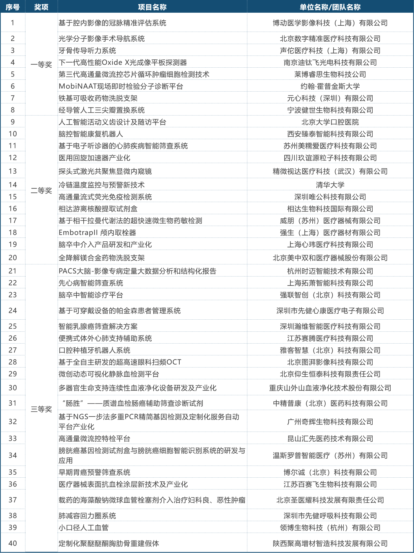 第二届(2019)中国医疗器械创新网创业大赛决赛获奖名单